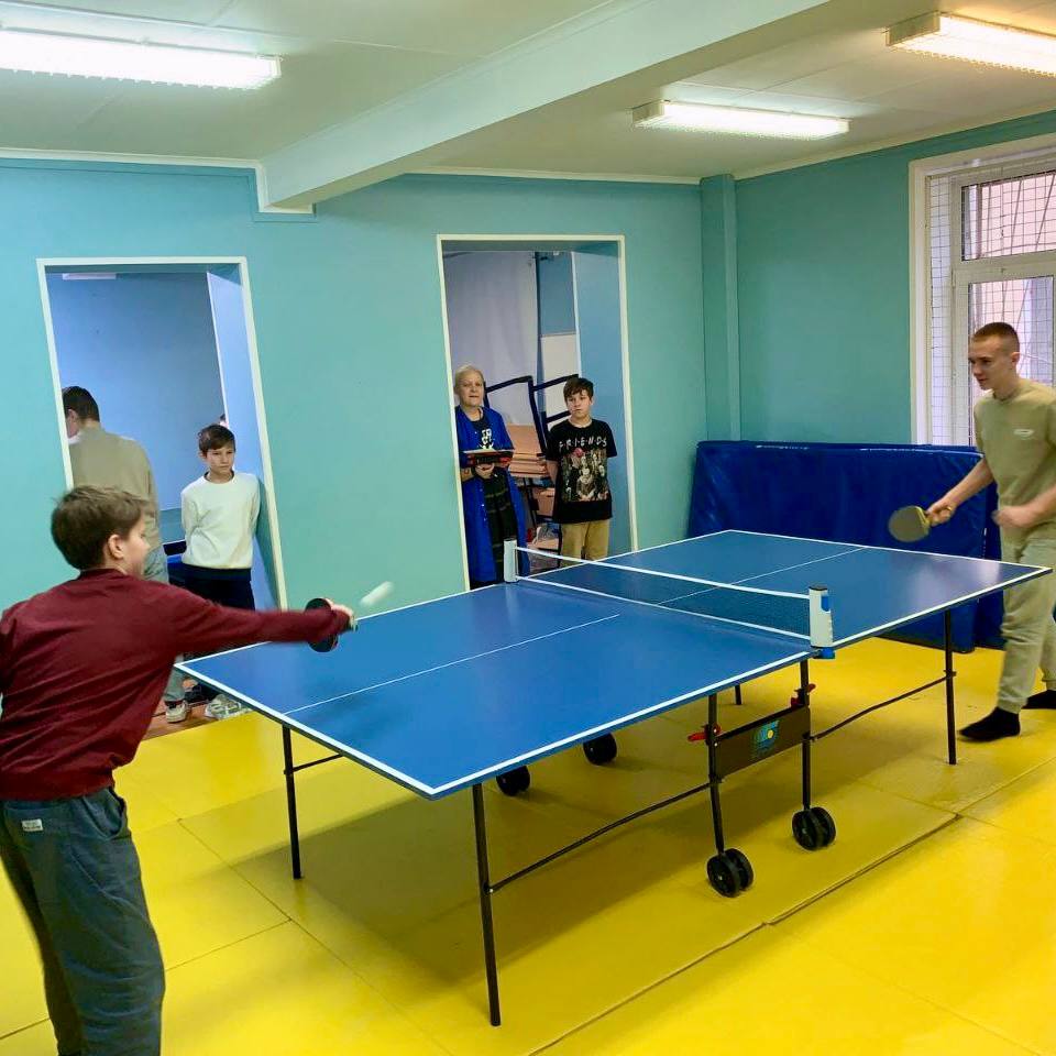 Настало время настольного тенниса — мы уже начали турнир. Ребята проводят перемены в игре, вокруг собираются зрители и команда болельщиков.